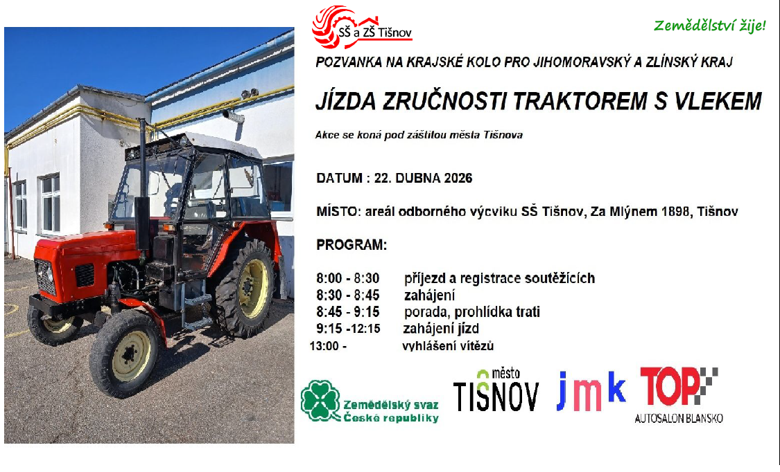 Dne 22. 4. 2026 se na naší škole uskutečnila krajská soutěž Zemědělský opravář. Soutěž je určena pro žáky oboru Opravář zemědělských strojů 2. a 3. ročníku a probíhala na odloučeném pracovišti naší školy Výrobní 1, Přímětice.