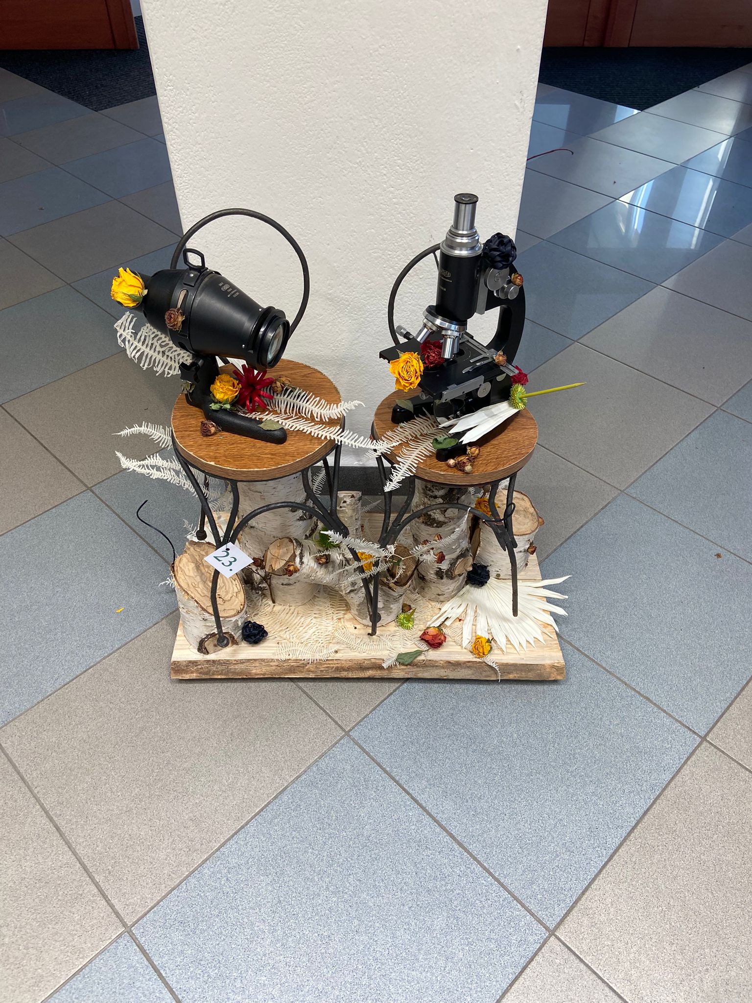 V této disciplíně vznikaly odvážné floristické kompozice z recyklovaných předmětů. Naši reprezentanti využili zrcadlo položené na vinném soudku, starý okap či vyřazený mikroskop s lampou.