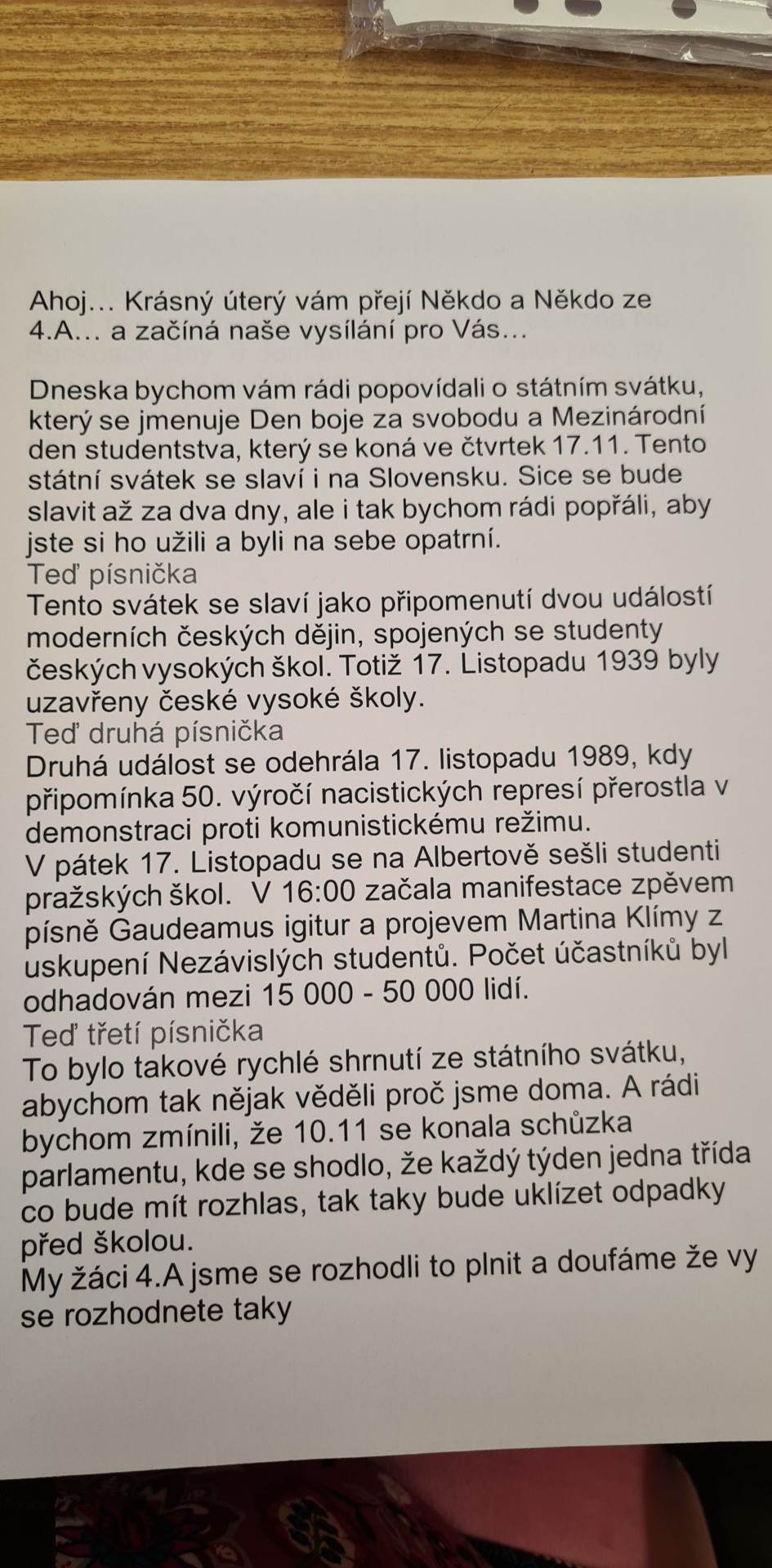 Dnes informovalo studentské rádio o tom, proč máme ve čtvrtek volno – co je za státní svátek? Také jsme od 4. A dostali oznámení ze školského parlamentu o tom, že třída, která bude mít vysílání, bude v tomto týdnu i uklízet prostor před školou. Super nápad!