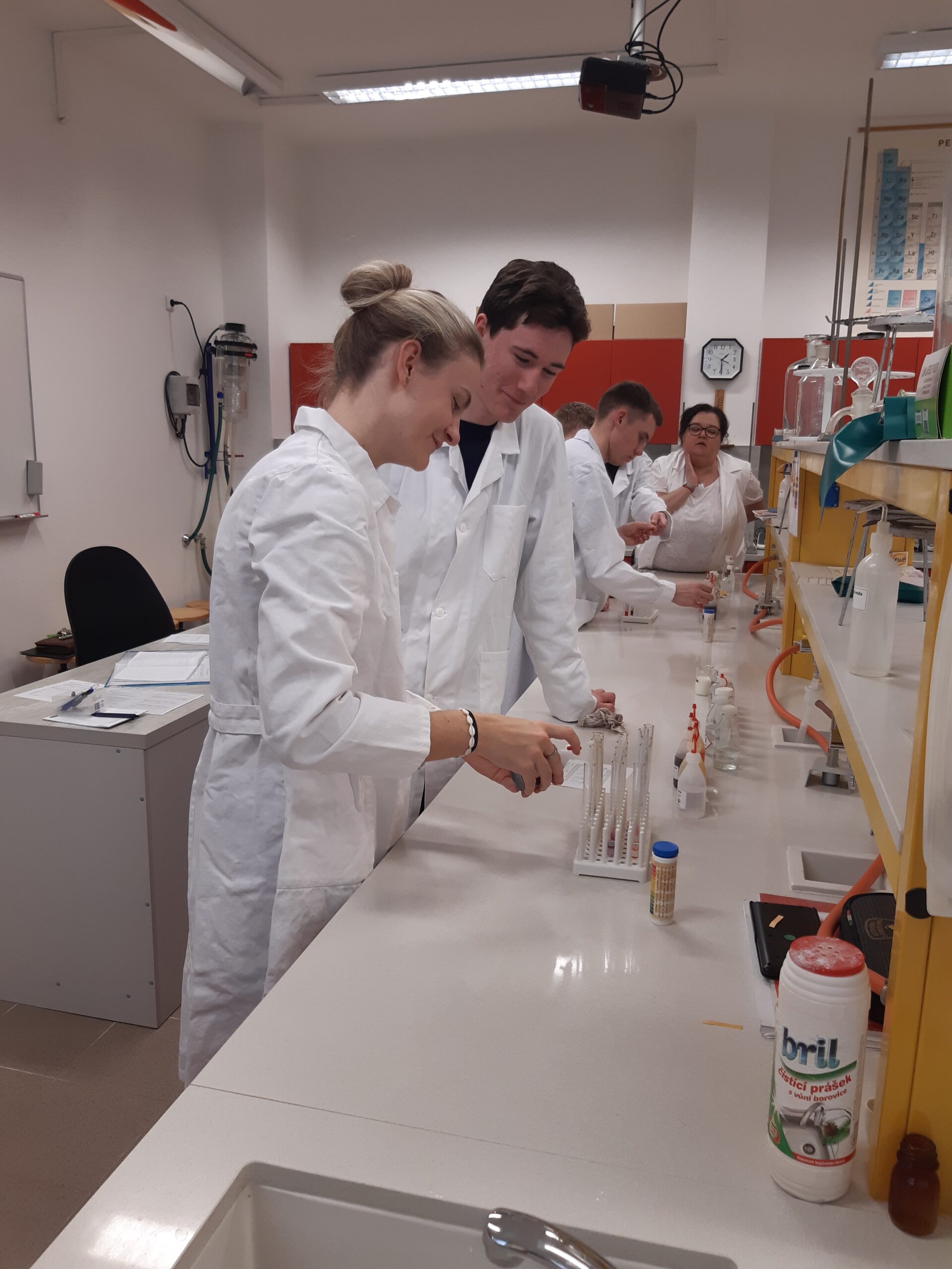 Tento týden měla třída 2. ročníku oboru Agropodnikání výuku v chemické laboratoři. Ověřovali si zbarvení acidobazických indikátorů v alkalickém a kyselém prostředí a určovali, jak se změní pH půdního roztoku, pokud budou zemědělci pole hnojit minerálními hnojivy. Mimo jiné stanovovali pH roztoků látek, se kterými se ve svém životě setkávají, jako např. mléko, jablko, citron, ocet, mýdlo, sprchový gel aj. …