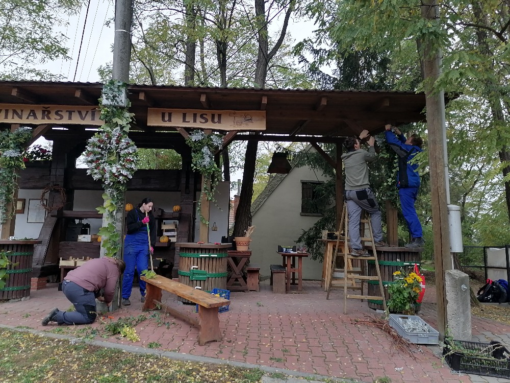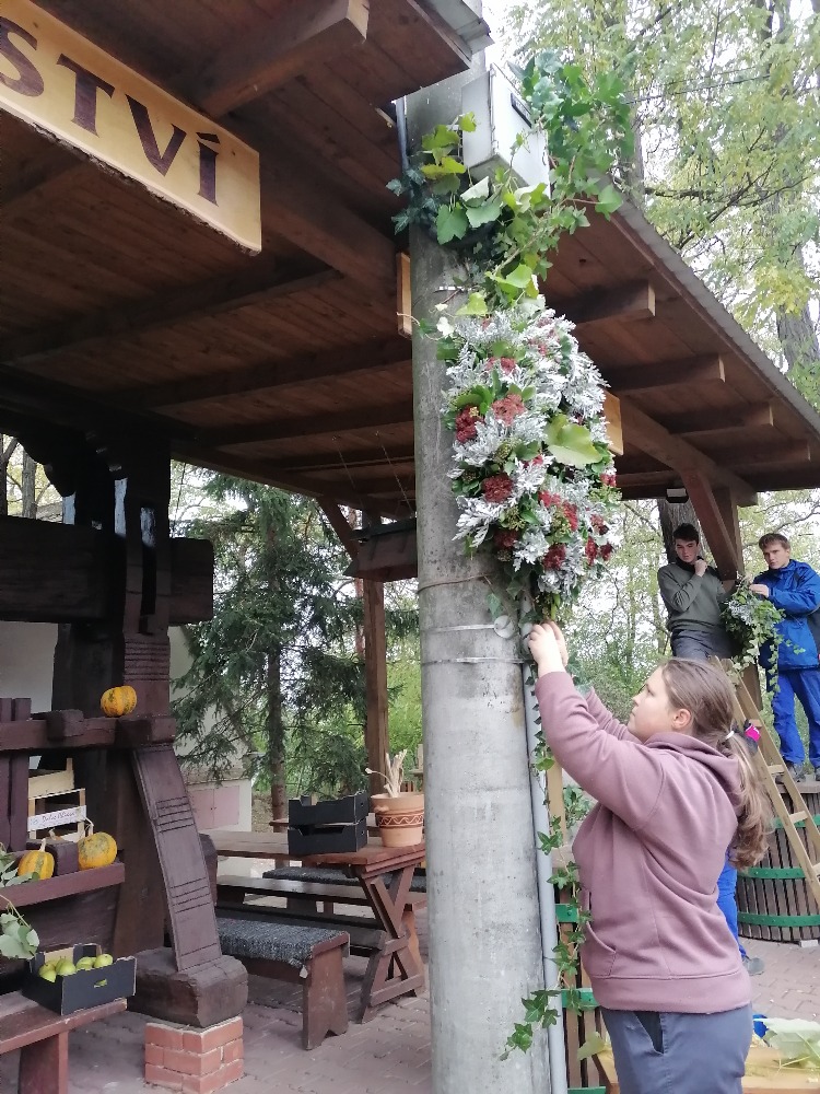 Na střed pergoly, která lis hlídá před nepříznivým počasím, jsme upevnili věnec s podzimní tématikou. Z větví břečťanu a starčeku jsme uvázali kytičky, kterými jsme ozdobili pergolu. Celé aranžmá vytvořilo krásnou podzimní sváteční atmosféru. Hrozny, které měli vinaři k dispozici, jsme naaranžovali do dřevěných přepravek a umístili kolem krásného lisu.