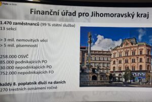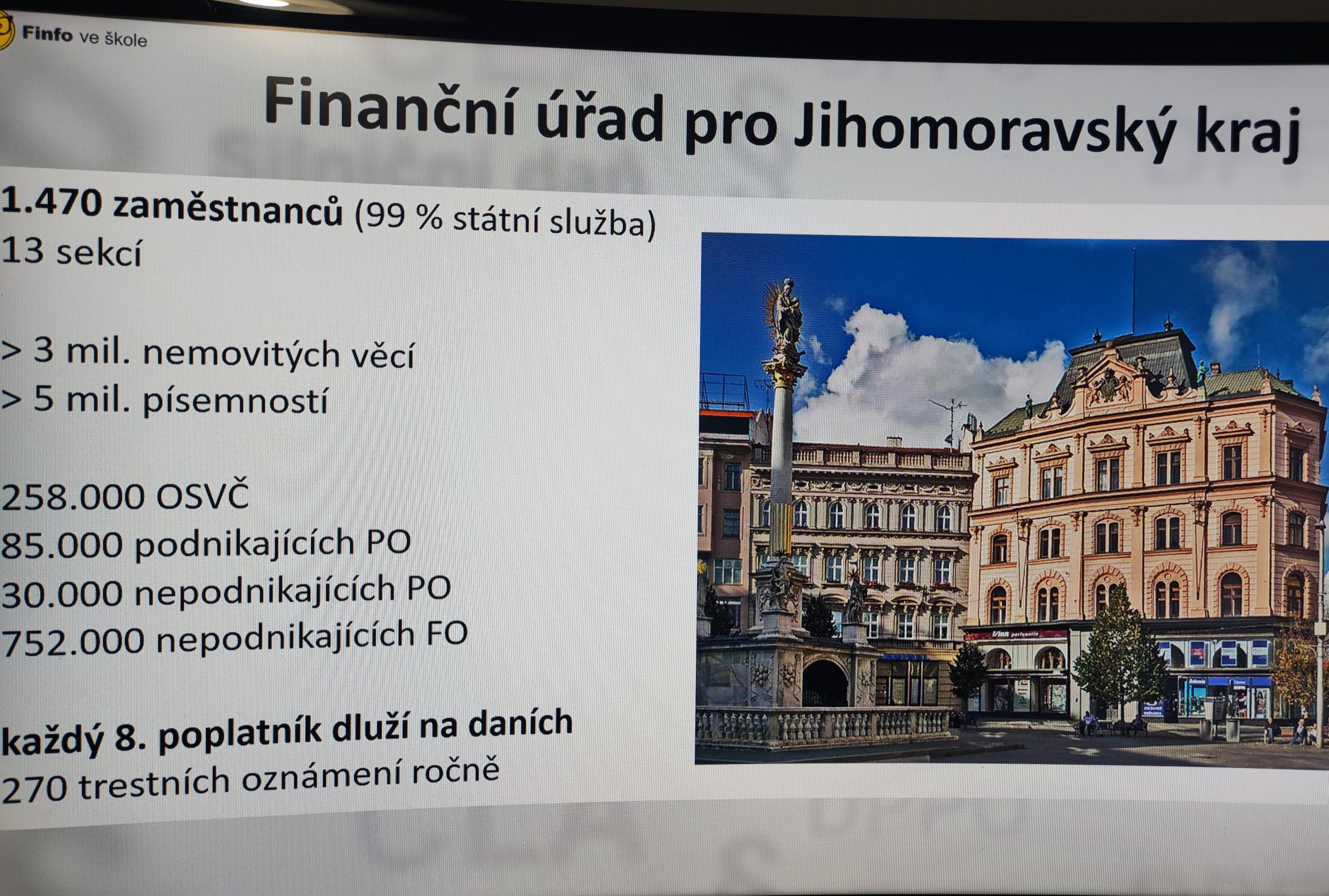 V rámci projektu „Daně a cla do škol“, který je realizovaný pod záštitou MŠMT, proběhly na naší škole přednášky určené pro žáky oboru Podnikání. Přednášel JUDr. David Stančík z Finančního úřadu pro JMK, který studentům přiblížil problematiku daní srozumitelnou a poutavou formou. Přednášky byly zaměřeny na daně, daňový systém i fungování finančního úřadu. Dozvěděli jsme se například, jak se zdaňují brigády, jak požádat o vratku přeplatku na daních nebo na co si dát pozor při výdělcích na internetu …