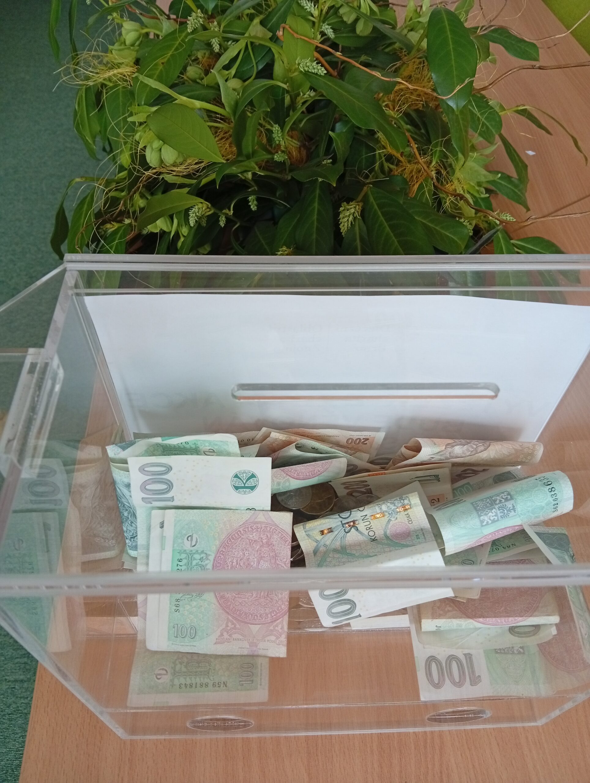 Celkem se od vás žáků a zaměstnanců školy vybralo krásných 8 559 Kč a 2,5 €.