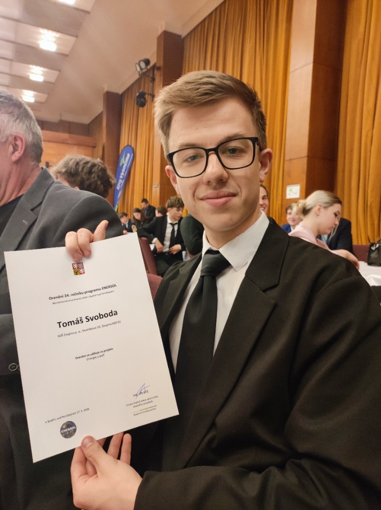 Ve dnech 26. – 27. 3. se v Bystřici nad Pernštejnem konala celostátní konference soutěže Enersol 2026. Naši školu zde reprezentoval žák Tomáš Svoboda ze třídy 2. OB, který postoupil jako vítěz krajského kola v kategorii Enersol a popularizace a zařadil se mezi nejlepší účastníky z celé republiky.