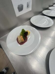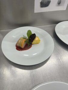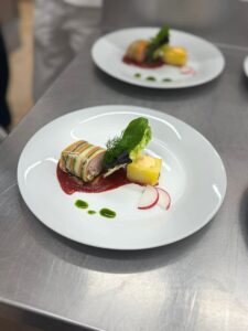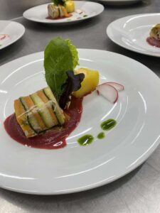 vepřová panenka sous-vide s cuketou a mrkví, omáčka z červené řepy a portského vína, pečený brambor plněný batátovým krémem s mascarpone …