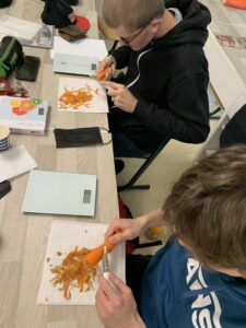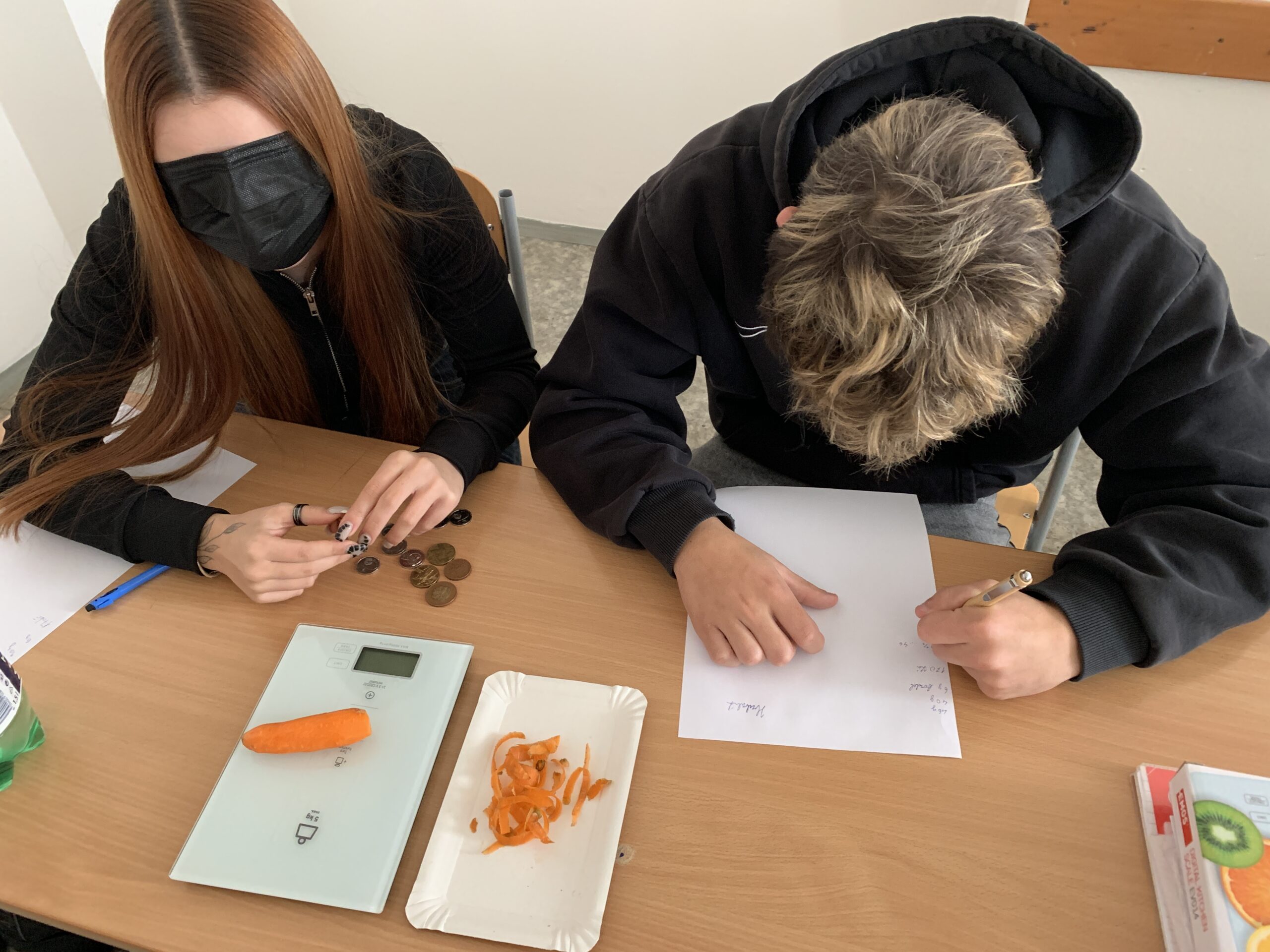 Nechyběla ani oblíbená matematika. Žáci pracovali ve dvojicích. Každá dvojice dostala mrkev – nejen jako zdravou potravinu podporující správnou funkci zraku, ale i jako učební pomůcku. Úkolem bylo vypočítat v procentech odpad po očištění mrkve. K tomu jsme využili nové digitální váhy, které se ukázaly jako praktická pomůcka i v matematice. Odměnou bylo pochutnání na čerstvé mrkvi, zatímco slupky posloužily jako pochoutka pro králíky.