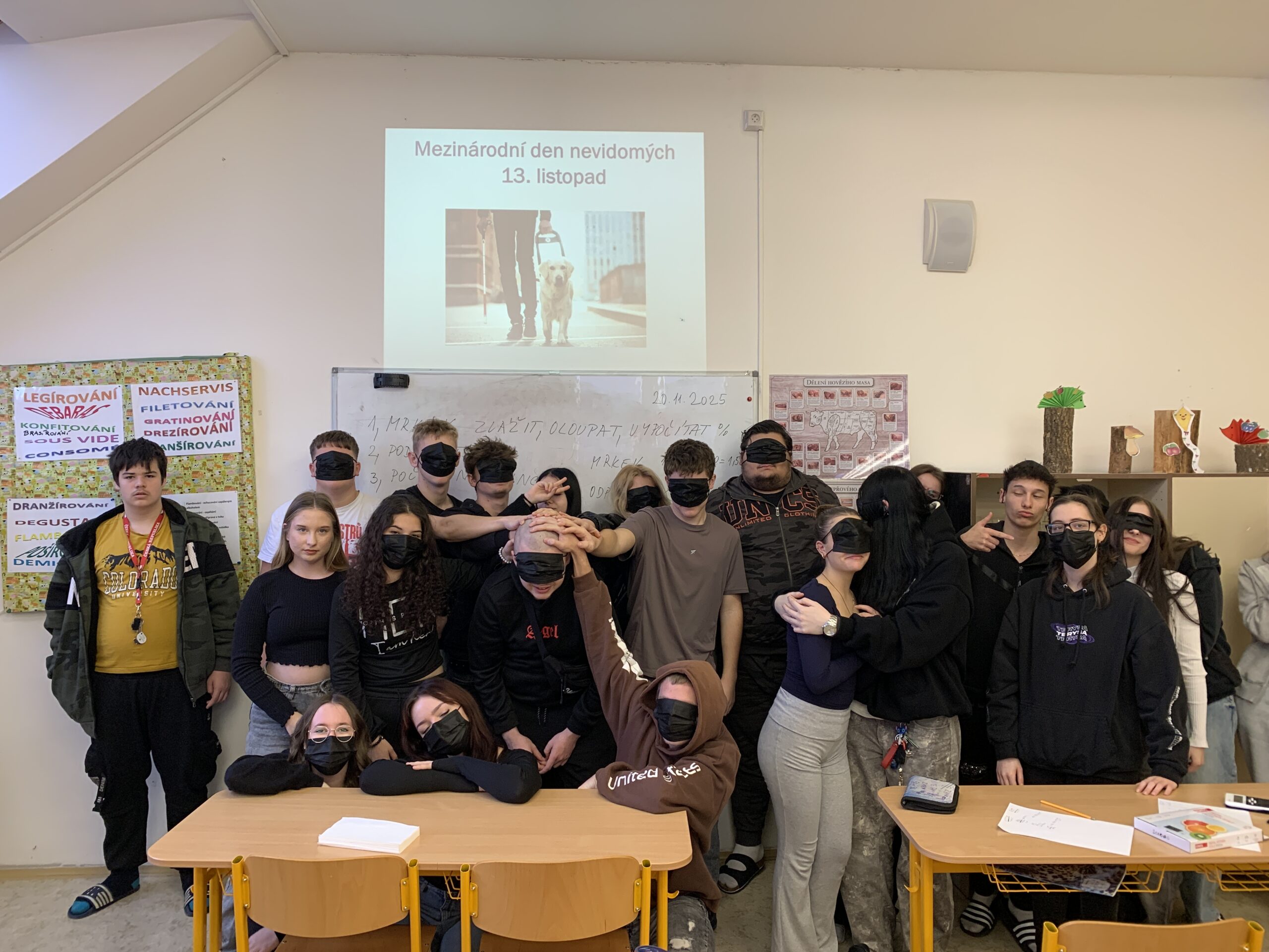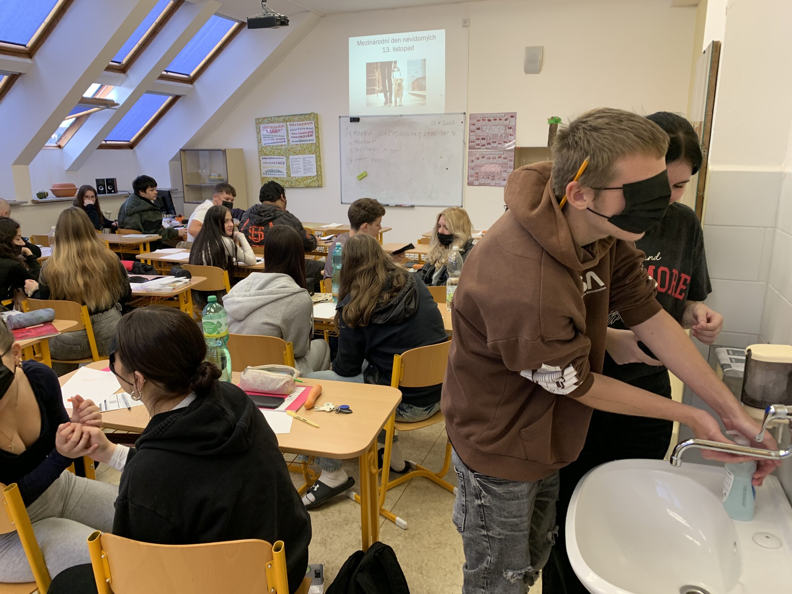Žáci si pomocí černých roušek na očích vyzkoušeli, jaké to je n e v i d ě t a fungovat bez zraku. Měli za úkol: spočítat mince, podepsat se, napsat své telefonní číslo, dojít k umyvadlu, umýt si ruce mýdlem, utěrku vyhodit do koše a vrátit se zpět do lavice v doprovodu spolužáka.