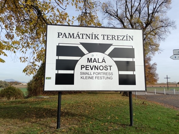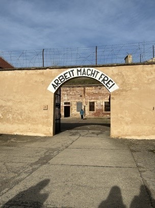 Když jsme přicházeli k Terezínu, procházeli jsme kolem několika pomníků, kde bylo uloženo více než 10 000 obětí … Památník Židům a křesťanský kříž. Vcházeli jsme do Malé pevnosti nad průchodem na náměstí, kde bylo napsáno „Arbeit macht frei“ ˇ= Práce osvobozuje.