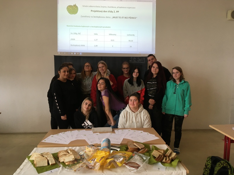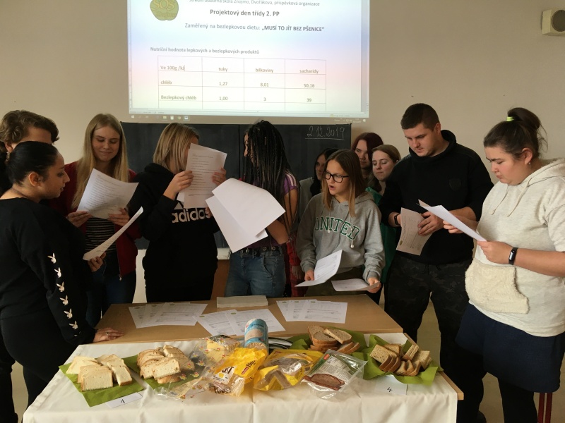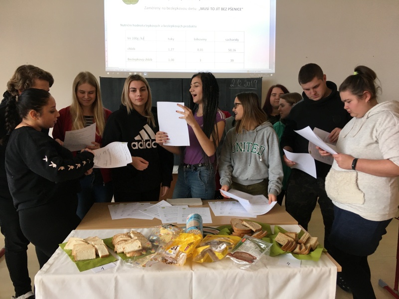 Kolik nemocných je dle registrovaných pacientů v ČR rozdělených v jednotlivých věkových kategoriích a dle pohlaví počítali žáci v procentech s paní učitelkou v matematice. V cizích jazycích vyhledávali žáci odborné termíny týkající se tématu. V českém jazyce předala paní učitelka žákům vlastní zkušenosti s bezlepkovou dietou v poutavé přednášce a následně shlédli odborné video. V odborných předmětech byli žáci obou oborů spojeni se svými vyučujícími odborných předmětů. Po úvodním seznámení se základními surovinami žáci ochutnali běžné a bezlepkové pečivo i chléb, pufované i extrudované výrobky. Vžili se do role degustátorů a své smyslové hodnocení individuálně zaznamenávali do pracovních listů. Subjektivně určovali vlastnosti vzorku a posouzení chutě. Dalším úkolem byly výpočty nutričních hodnot potravin, porovnávání cen výrobků z předem zjištěných údajů z uskutečněného průzkumu trhu běžného a bezlepkového pečiva vyjádřeny i procentuálně. Součástí pracovního listu byl i dotazník, kde jsme vyhodnotili zajímavé otázky a vedli diskusi.