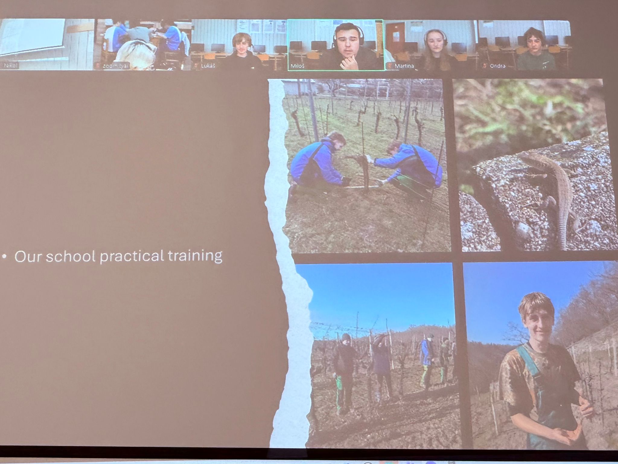 Další setkání proběhlo minulý pátek 10. dubna, tentokrát především se studenty prvních ročníků 1.A. Naši studenti si připravili prezentaci zaměřenou na vinařství ve znojemském regionu. Představili známou viniční trať Šobes, zmínili moderní technologie výroby vína a přiblížili také praktickou výuku na naší škole, jejíž součástí je školní vinohrad, o který se studenti učí pečovat.