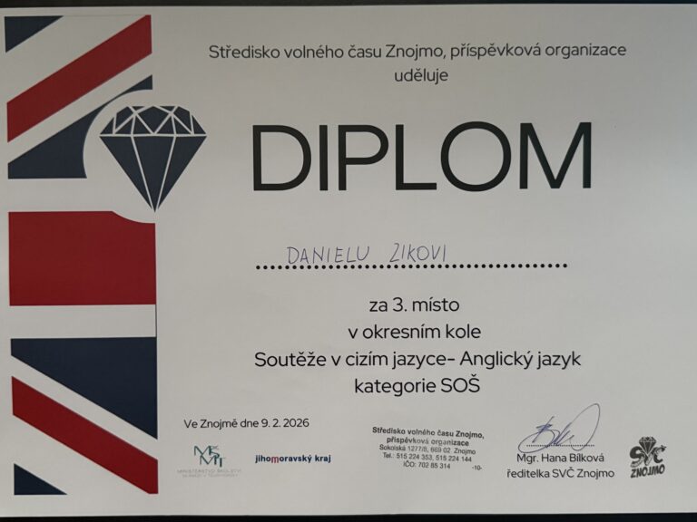 Náš student Daniel Zika ze třídy 3.A získal krásné 3. místo v okresním kole Soutěže v anglickém jazyce v kategorii SOŠ, které se konalo ve Znojmě. Letošní ročník byl zaměřen výhradně na konverzaci – soutěžící byli rozděleni do dvojic a jejich úkolem bylo pohotově reagovat, diskutovat a přirozeně spolu komunikovat v angličtině …