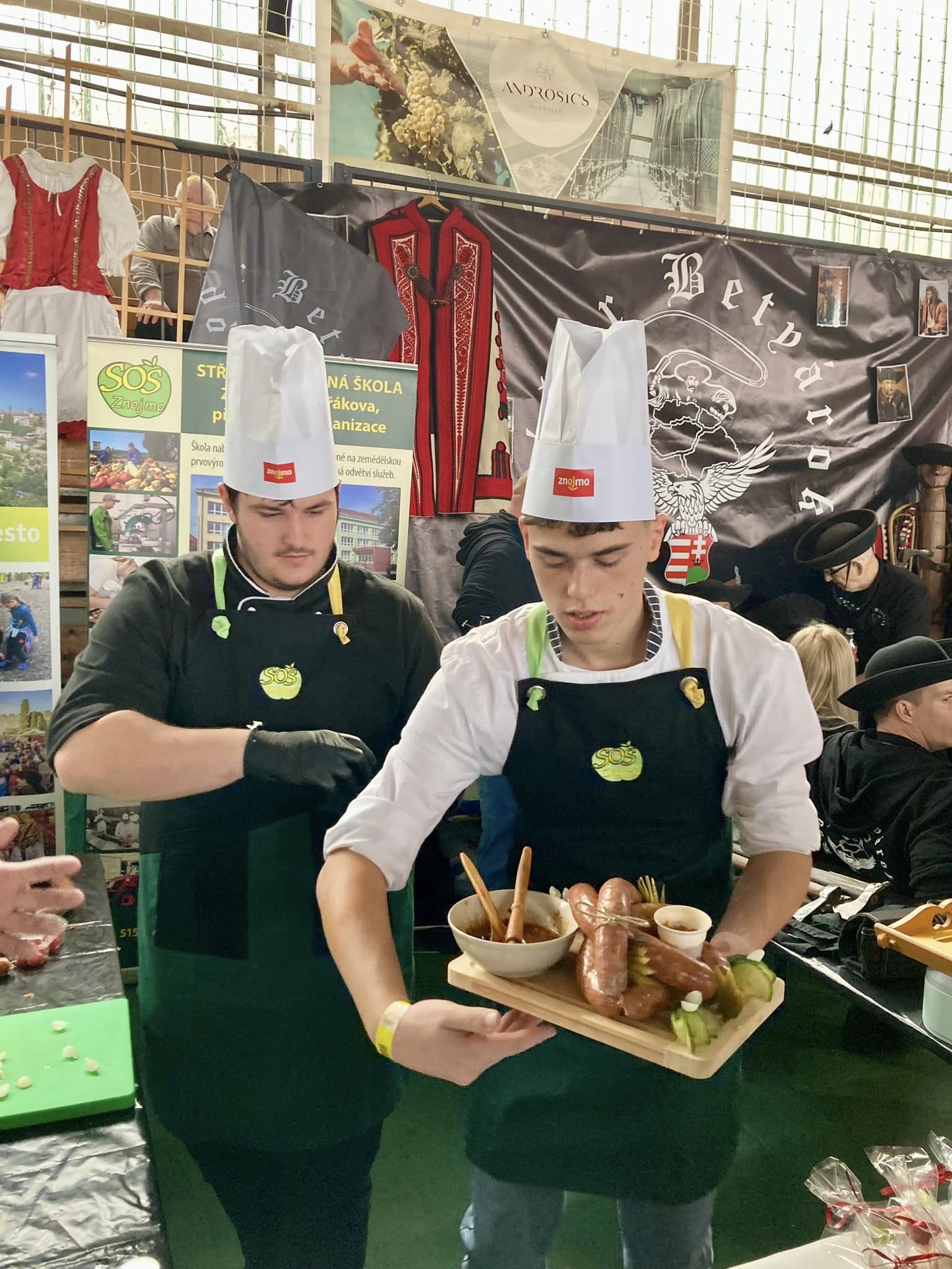 Naši žáci 3. ročníku oboru Kuchař-číšník – Tobiáš Jaroš, Petr Haindl a Šimon Bartoněk – se pod vedením pana učitele OV Michala Kocha o víkendu 10. – 11. 2. 2024 zúčastnili spolu se zástupci města Znojma soutěžního Klobásového festivalu v maďarském městě Fonyód.